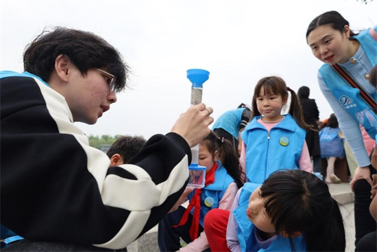 来到丰收湖湖畔一角,浙江水利水电学院水资源协会的志愿者们已经早早在等待着大家。丰收湖的水质究竟如何?一场水质实验小课堂为大家揭开了谜底:30毫升水加3滴桔红色的生态活性水试剂,水变成了紫红色;30毫升水加褐色的ph试剂,水变成了蓝色;5毫升水加10滴深蓝色的硬度试剂,水从粉色最终变成了蓝色……神奇的化学现象在孩子们眼前呈现,志愿者详细地给大家介绍着每个试剂的作用并解读着每次实验的结果。“丰收湖里的水可以直接喝吗?”孩子们听说丰收湖湖水能达到饮用水水质标准时发出了疑问。“总体来说,丰收湖的水质还是不错的,但就算水质好,湖里的水也不能直接喝,只有经过净化等一系列处理并达到饮用标准的水才是可以饮用的。”志愿者进一步科普。