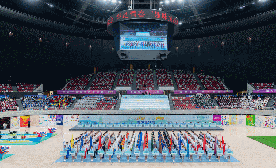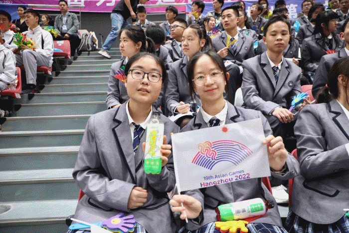 运河体育公园体育馆内,当来自杭州19所高中的19支参赛队入场时,现场除了被学生们嘹亮的口号以及充满创意的互动吸引外,这19所学校的助阵嘉宾们同样“吸睛”,比如东京奥运会女子平衡木冠军管晨辰、浙江省鲁迅文艺奖获得者金琤、北京奥运会女子体操团体冠军成员江钰源……
