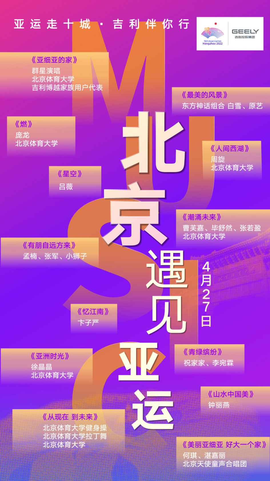 “请你来到我身边,齐聚世界的盛典,我们已准备了千年……”4月27日,“亚运走十城 吉利伴你行”全媒体文化推广活动收官之站落地“双奥之城”北京,杭州亚运会官方主题推广曲《从现在 到未来》响彻神州,亚洲再起雄风。