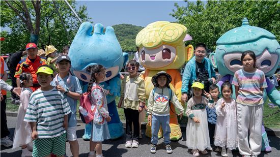 上午10点多,“三小只”一出现在北山路瞬间就成为了西湖边的焦点。吉祥物们憨态可掬的样子,吸引着大批小朋友和家长们前来围观。与“三小只”合影成了在场每个小朋友的第一“愿望”。