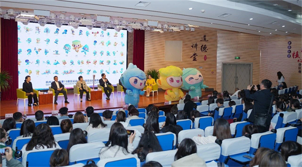 当杭州亚运会吉祥物琮琮、宸宸、莲莲出现在报告厅时,气氛掀起了一阵高潮。