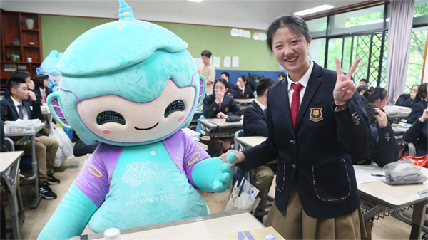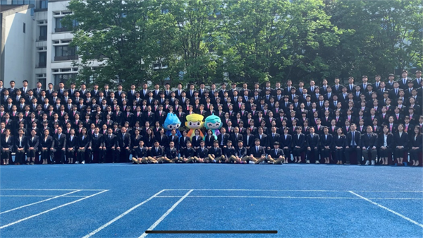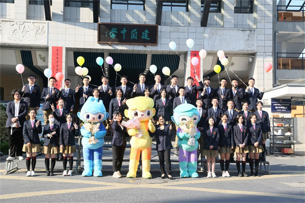 5月9日下午,杭州亚运会吉祥物琮琮、宸宸、莲莲受邀来到杭州市建兰中学,和初三毕业班的同学们一起拍摄毕业照,同时为今年所有参加中考和高考的同学们加油。