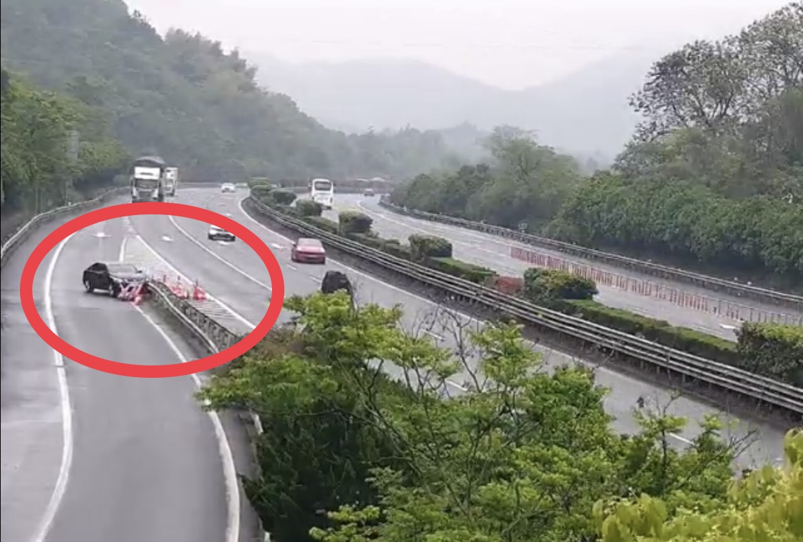 近日,在杭新景高速建德服务区入口,一辆在第二车道上正常行驶的黑色小车突然实线变道,径直往服务区入口分流岛护栏撞去,而后停在服务区入口匝道上。
