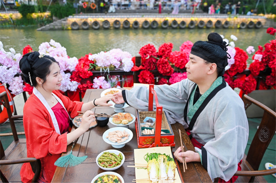 晚间的双人花船宴席无疑是古镇节日中浓墨重彩的一笔,游客乘坐画舫船与心爱之人游览运河,在享用美食的同时欣赏沿岸美轮美奂的舞蹈表演,打卡古镇夜景的另一番旖旎的风光。与此同时,雷迪森酒店内的塘栖运河法酷原浆啤酒烧烤节让当天活动变得可玩、可观、可享。“滋”博烧烤撩拨味蕾、乐队表演激情嗨唱,历史古韵与青春潮流融合碰撞,切实提升了游客的体验度与获得感,让古镇烟火气邂逅诗与远方。宋韵下午茶、塘栖十大碗、跟着谚语吃美食等相关系列活动也为古镇注入了新动能,游客在沉浸式场景体验中感受水乡品味、江南风味、塘栖韵味,让塘栖古镇的文化气韵融入生活、浸润人心、焕发生机与活力。