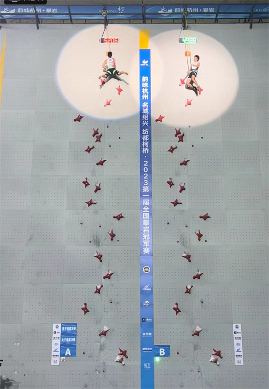 5月30日晚,“韵味杭州·名城绍兴·纺都柯桥”2023第一届全国攀岩冠军赛速度决赛在绍兴柯桥羊山攀岩中心举行。