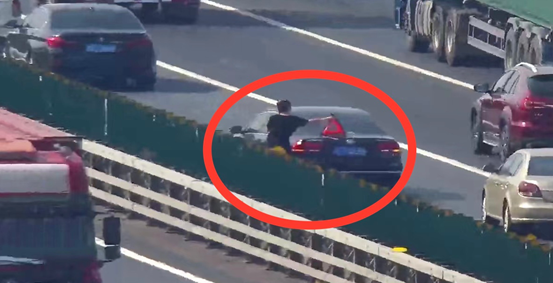没多久,车上下来驾驶员,一边打着电话一边从后备箱拿出三角牌,以为她要往车后方走去放三角牌时,没想到她直接把三角牌放在了车子后备箱上,并且继续在车旁边打电话。