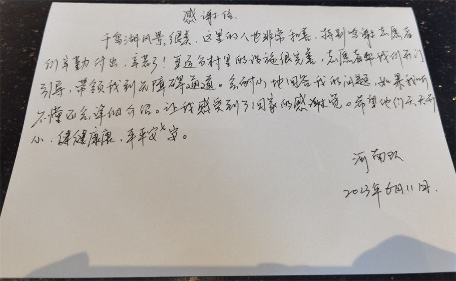 “千岛湖风景很美,这里的人也非常和善,特别鸣谢志愿者们辛勤付出,辛苦了!”6月15日,刚完成2023年全国残疾人自行车锦标赛暨“韵味杭州”亚残运会志愿服务工作的浙江财经大学东方学院的志愿者,收到了河南队、上海队队员的感谢信。