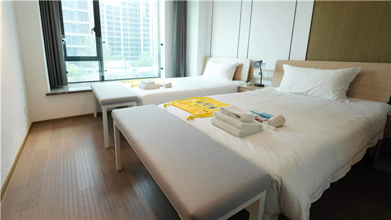 随意走进一间运动员的房间,客厅有电视,阳台有洗衣机,就连床都尽显温馨。记者注意到,一些床的床尾放有伸展器,可将原本1.2×2米的床进行延伸。“考虑到篮球、排球等运动员身高的特殊需求,我们按照人数7%的比例配置了床伸展器。伸展器的尺寸是120×40cm,可以满足任何身高的运动员。”工作人员表示。