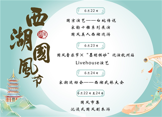 活动分为“国家京剧院演艺、国风音乐节、西湖武林大会”三大专场,现场还有国风市集、“宋韵十雅”系列展演、沉浸式国风剧本游、Livehouse演艺、国风美人立体式游园等精彩互动配套环节贯穿。