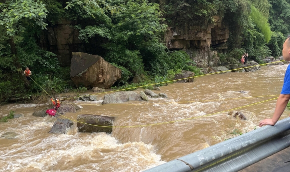 在下游的救援现场,民警联合消防、户外救援人员,在河岸的一侧用大树作为固定点,使用绳索搭建起一条横渡溪流的救援通道。救援人员携带救生衣通过绳索顺利划至“孤岛”,让被困人员逐一穿上救生衣,按照“先孩子、后成人”的原则,有序将20名被困人员顺利转移至安全地带。直至晚上19时30分,历时3个小时,22名被困人员全部营救至安全区域。
