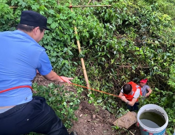 由于风大雨大、河水湍急,被困人员情绪非常紧张,救援人员通过喊话的方式稳定被困者情绪,充分研判形势后,在熟悉地形的村民带领下兵分三组立即展开救援行动。在上游救援现场,民警系好救援绳携带救生衣,徒步涉水绕道到中间的河床上,到达后,民警和村民固定好救援绳,在水面上架起一条“安全通道”,为被困人员穿好救生衣后,在民警的带领下,上游2名被困者成功转移到安全地带。