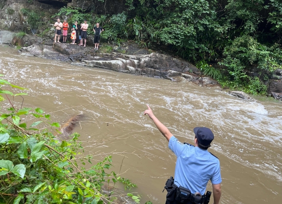 当日16时30分,临安区公安分局高虹派出所接群众报警称:因下大雨溪水暴涨,有游客被困河中央。接警后,值班所领导王金乐,带领民警景虎,辅警汪杰、王泽平等十余人携带救援绳、救生圈等装备赶赴现场展开救援,同时联动消防、户外救援队以及镇村干部等50余人。