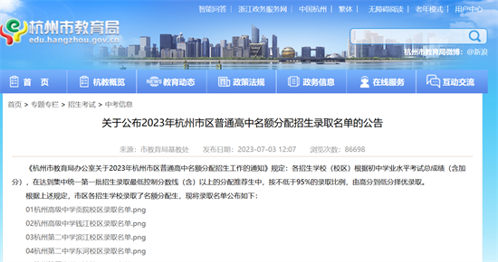 7月3日,杭州市教育局发布2023年杭州市区普通高中名额分配招生录取名单。