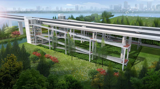 上下引桥整体采用“之”字结构,一方面实现现有空间最大化利用,能进一步保障通行安全性和效率,另一方面,立体的造型与蓝灰色的钢结构,与周边绿化景观、白色的江东大桥相映成趣,实用之余更显简洁之美。
