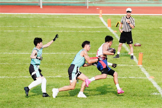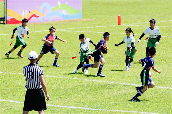 腰旗橄榄球是一项新兴潮流大众化体育项目,与传统橄榄球相比,这项运动改变了擒抱和推击等危险的防守动作,防守方将通过扯下进攻球员佩戴于腰际的一条腰旗进行防守,以减少训练中的受伤风险。作为一种安全的“非冲撞性”运动,不失橄榄球之精华的同时又具有极强的娱乐性,近年来,腰旗橄榄球火速出圈,从小众走向大众,从“潮运动”走向“常运动”,成为越来越多年轻人青睐的日常健身项目,在世界30多个国家和地区的青少年群体中广为流行。