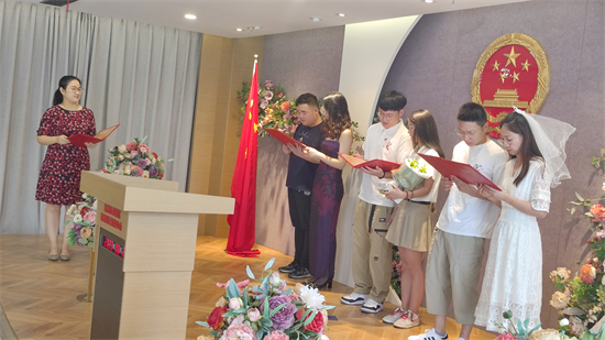 在现场,有由西湖区民政局领导作为特邀颁证员主持的集体颁证仪式、婚姻家庭辅导课堂、甜蜜赋能游戏互动,还有针对七夕节习俗开展了趣味投壶、传统剪纸、民俗音乐表演等传统文化展示,引导广大新人在游戏中传承节日文化、倡导婚俗新风尚。工作人员向新人发放婚事新办简办宣传单,提倡健康向上的婚俗文化氛围,让婚姻本质更“单纯”、婚姻准备更“充分”、婚礼更有“仪式感”。