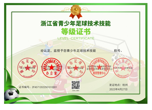 测试结束后,小球员将获得由浙江省足球协会、杭州市青少年校园足球工作领导小组办公室、杭州市足球协会、杭州市智力运动共建学校和足球特色学校培育管理中心、杭州市校园足球协会联合颁发的等级证书,授予荣誉称号。此外,每个小球员还将拥有专属的个人足球数字档案,可以持续更新自己的足球相关信息。