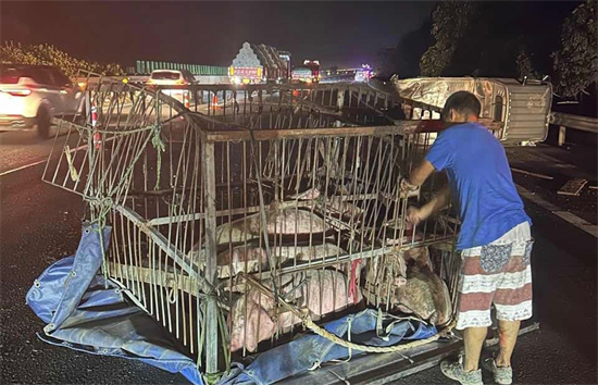 接到警情后,附近巡逻民警立即赶往现场。只见现场一片狼藉,撞击造成的散落物掉了一地,一辆轻型普通货车侧翻在车道内,四五头生猪正在高速公路上乱跑。