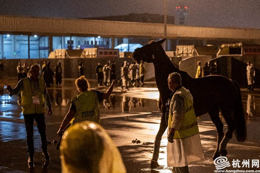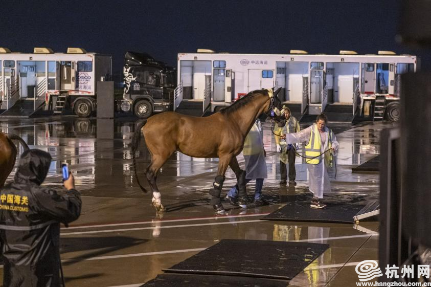 参赛马抵达杭州萧山国际机场后,口岸通关装卸环节是重中之重。据了解,马匹在机场口岸的通关、装卸涉及报关通关、口岸检疫、机场保障、生物安全防控等各方面,需要机场、海关、边检、农业农村等各部门的协同联动。杭州亚运会赛事总指挥部马术项目管理指挥中心相关负责人表示:“这些参赛马经过了十几个小时的长途飞行,状态比较疲惫,我们要在精准查验、确保安全的同时,尽可能缩短通关转运时间,保障马匹福利。”