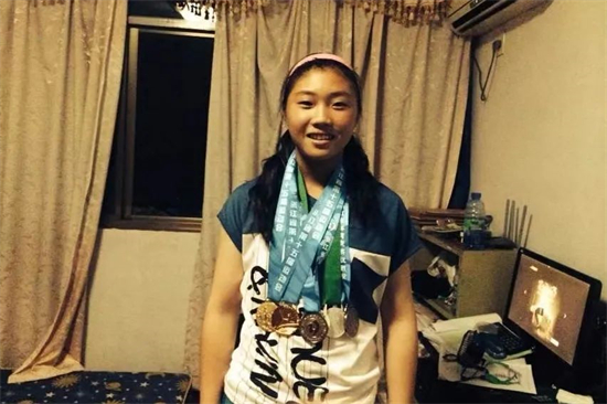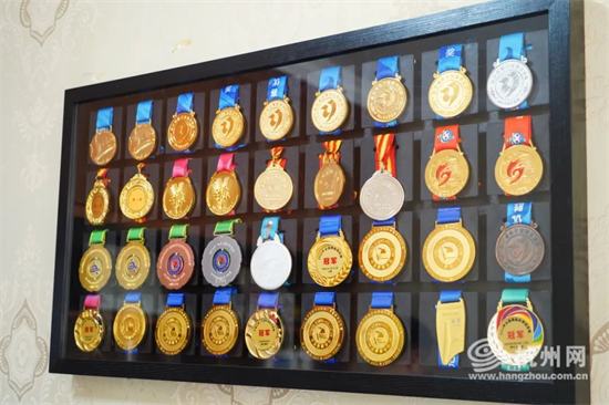 在佳琪房间的墙上,我们看到挂着一个裱起来的木框,里面是满满当当的奖牌。而她在国内的每一次比赛,邹来云都会带着妻子和二女儿、儿子到场助威,一家人整整齐齐。