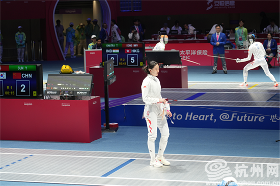 女子重剑个人赛四分之一决赛现场,右一为孙一文