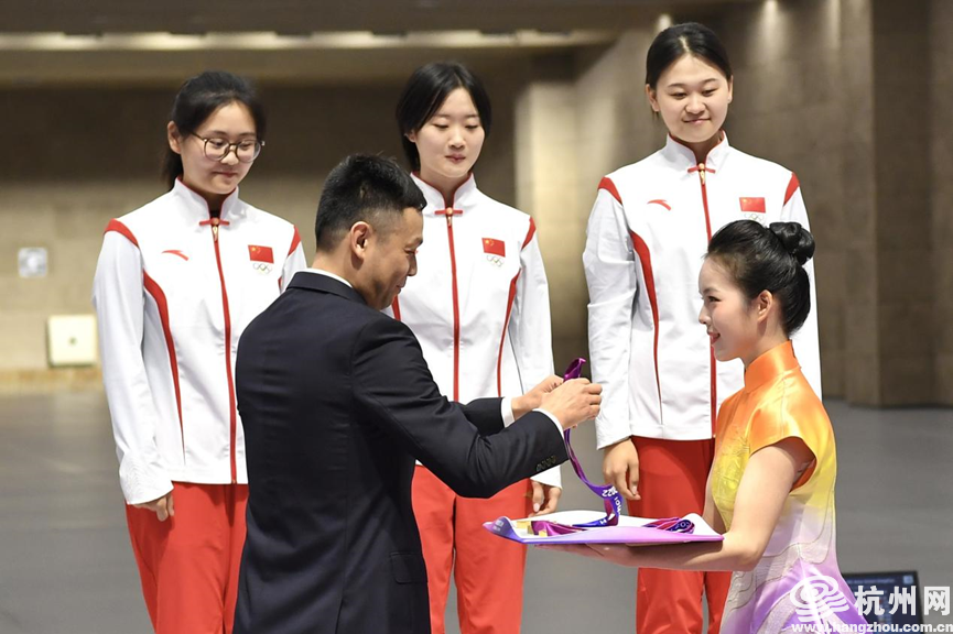 值得一提的是,在随后举行的女子50米步枪3种姿势团体赛颁奖仪式上,杭州亚组委竞赛部部长、射击奥运冠军朱启南为获得冠军的姑娘们颁奖,领奖台上的姑娘们笑得格外开心。