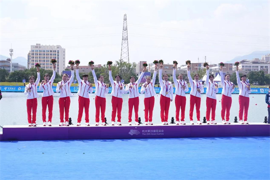 10月4日上午,杭州亚运会龙舟项目在温州开赛。两位杭州姑娘范逸婷、俞诗梦和队友王莉、史莹莹、程灵芝等人组成的中国队,获得女子龙舟200米直道竞速赛冠军!