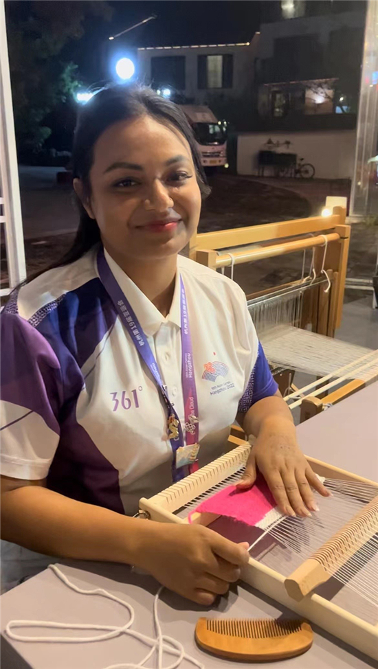 印度场地自行车选手舒茜卡拉·阿加谢在附近的传统手工艺展示体验区体验非遗织布,胸口的杭州七景徽章是她辗转从多名运动员手中换来的。阿加谢非常珍惜:“在这里你不知道会拿到来自哪个地方的礼物,这就是徽章交换带来的东西:惊喜。”