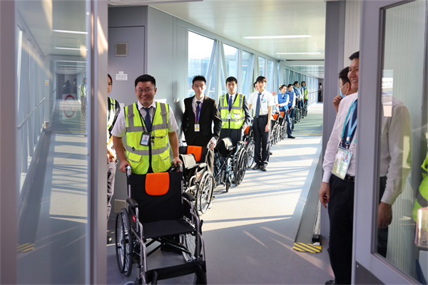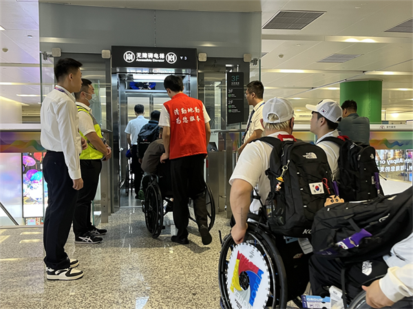 一路上,残疾运动员没有遇到一个台阶。廊桥口的无障碍电梯、流线上的无障碍坡道、清晰的标识标牌、随处可见的低位饮水机及服务柜台,完善的无障碍设施,都为残疾运动员创造了便利的出行环境。抵离工作人员和志愿者全程的暖心陪伴,更是让抵达流程“加速”与“升温”。