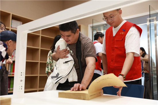 活动现场,在工作人员和志愿者们的陪同下,视障读者开启了新馆体验活动。视障读者用耳朵聆听讲解,用脚步丈量新馆,用手触摸了“抽屉式”杂志墙、造型各异的书架、“仰望星空”巨型铜雕、“书立方”玻璃书房、古籍阅览室等新馆特色建筑及设施。