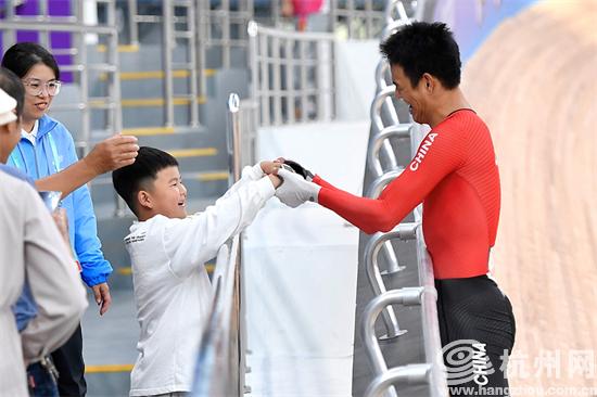 夺冠后,李樟煜和队员们激动地在场地继续骑行,并向看台上7岁的儿子李沐辰俏皮地吐了下舌头,赛后更是冲向看台和儿子拥抱和互相鼓励。