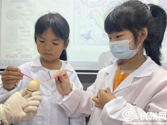 大家都知道孩子的牙齿需要涂氟,涂氟有什么作用呢?谢医生拿出一支氟防龋材料,孩子们对它十分好奇。大家对着氟防龋材料进行了一番观察。“它是黄色的,黏黏的,闻起来有点甜。”小记者看了看又闻了闻。为了让孩子们直观地认识到涂氟的作用,活动中大家做了一个鸡蛋涂氟实验。大家拿着小刷子轮流给一半的鸡蛋涂上氟,并把涂上氟的鸡蛋泡进白醋中。慢慢地,未涂氟侧的鸡蛋开始受到醋的侵蚀,表面冒起来许多细小的泡泡,涂氟一侧仍旧保持原样。通过实验,大家可以看到氟材料很好地保护了鸡蛋表面,让鸡蛋不受侵蚀,这也是涂氟保护牙齿的原因。