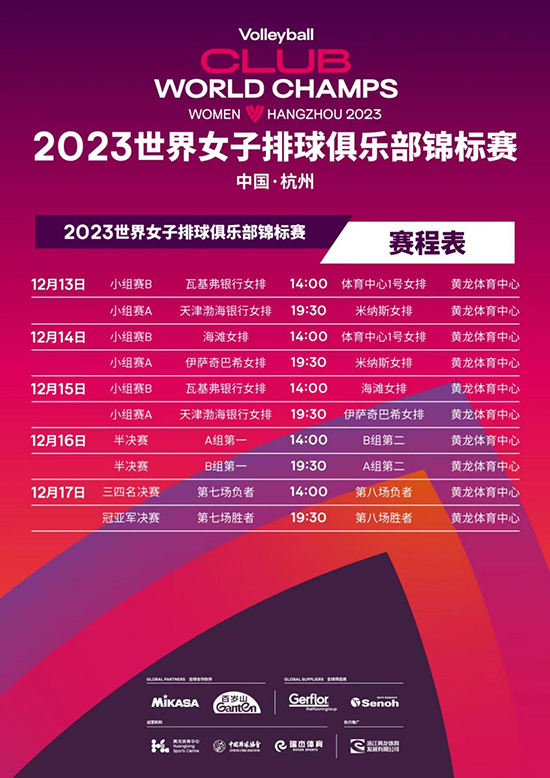 本次参赛队伍分为A、B两组,作为中国女排超级联赛“四连冠”队伍的天津渤海银行女排将在A组迎战土耳其伊萨奇巴希女排和巴西米纳斯女排,将于12月13日迎战首个对手巴西米纳斯。