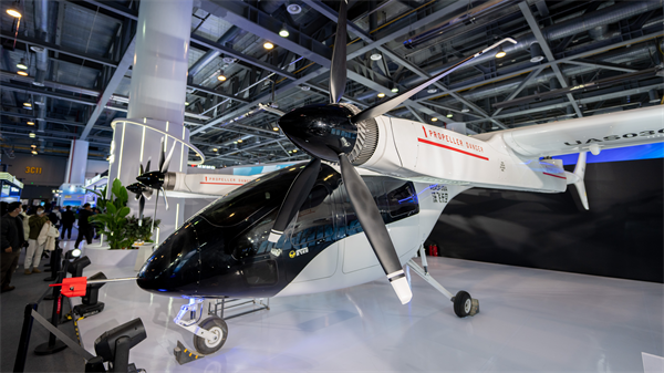 走进智慧航空馆内,“展馆之宝”——沃飞长空最新款纯电动垂直起降AE200飞行汽车吸引了记者的眼球,据介绍,此次博览会是该飞机在全球范围内首次以真机形式展出。