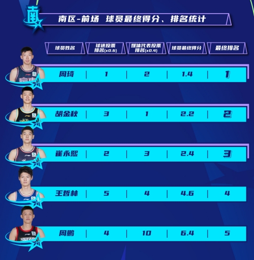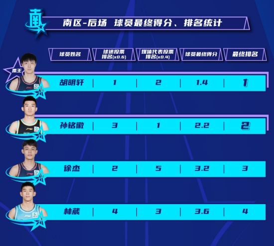 举例来说,在南区后场首发票选中,孙铭徽虽然在球迷投票中排名第三,但在媒体代表投票中位列第一,那么他的得分就为2.2分(3×0.6+1×0.4),仅次于1.4分的胡明轩,成功反超徐杰,携手胡明轩成为首发。而作为球迷票选第二的徐杰,由于在媒体投票中只排在第五,最终排名跌至第三。同样的情况还发生在曾凡博的身上,他在北区前场球员的球迷投票中位列第三,但在媒体投票中只排在第五,最终被张镇麟超越,无缘首发。