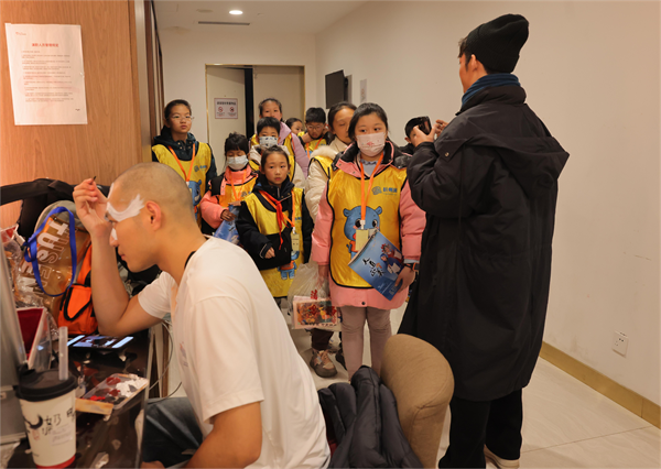 来到演员化妆间,小记者见到了《天道正义》中包公的扮演者骆侃,他正在化妆为上台做准备。包公为什么画黑脸?胡浩彬以大家熟知的歌曲《唱脸谱》为引入,给小记者们解释了黑色脸谱的含义。原来在传统的戏曲中,不同的脸谱颜色代表着不同的角色性格,戏剧里象征正直、刚正不阿的人物形象通常用黑脸表示。