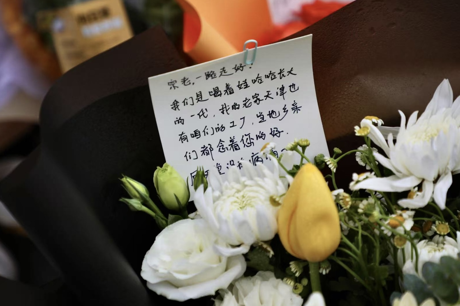 “我们是喝着娃哈哈长大的一代,我的老家天津也有咱们的工厂,当地乡亲们都念着您的好。愿宗老,一路走好!”一张卡片上写道。