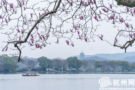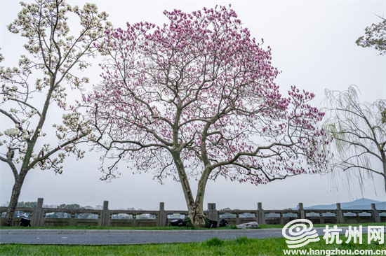 这株玉兰花,在上世纪50年代西湖国宾馆重新设计时便栽种了。它大概是西湖周边最容易出片的玉兰花了——背靠西湖苏堤,远远能看见雷峰塔、保俶塔、城隍阁等一众西湖地标,花朵盛放的时候粉灿若云霞,每年花期都会吸引不少游客前来打卡拍照。