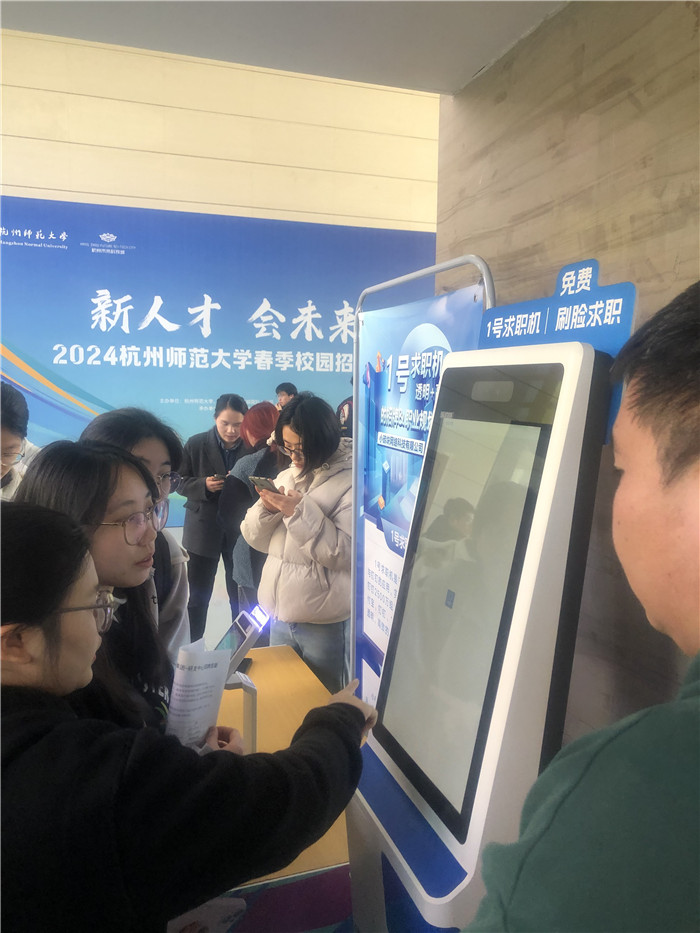 值得一提的是招聘会现场1.8米的max版数字求职机,它首次出现在杭州高校招聘会,为毕业生求职流程提供了“科技”的助力。据悉,这款数字求职机叫做“1号求职机”,毕业生只需要在求职机上点击职位并进行刷脸,即可生成简历数据,点击报名确认之后,企业就会收到毕业生的求职信息,整个过程只需15秒,能够大大提高求职效率。杭师大信息学院学工办主任杨鹏飞表示,目前1号求职机已经和杭师大的学科专场招聘会同步投放了“特制版”,岗位筛选会按照专业跳转。“比如今天举办的是杭师大信息科技专场招聘会,那我们求职机里的岗位就都是杭师大信息科学行业的相关专业,学生只需要选择自己的专业,展示出来的岗位就都是符合他们的。”