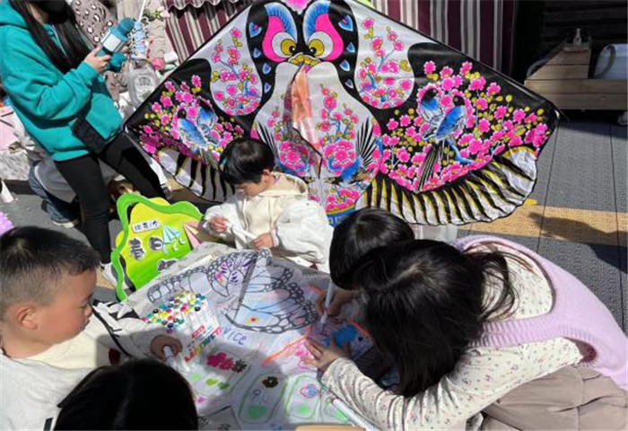 记者发现,还有小朋友拿起画笔画风筝,还背起了诗词“儿童放学归来早,忙趁东风放纸鸢”。