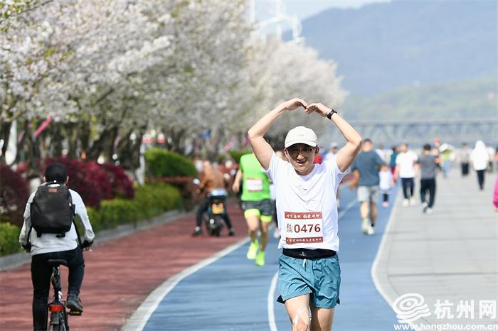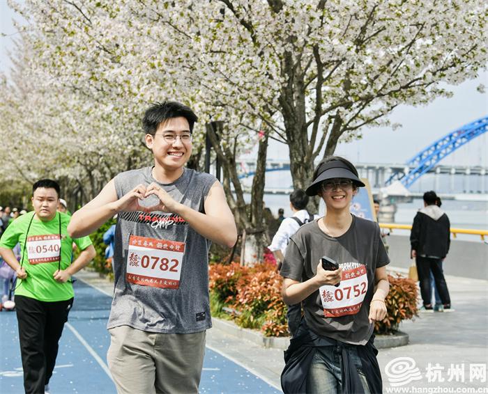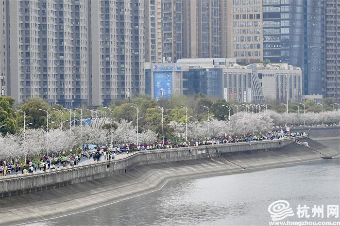 当天滨江沿岸的樱花大道上,三千余株樱花竞相绽放,粉白相间的花瓣随风飘落,如同雪花般纷纷扬扬。奋进的脚步,爽朗的笑声,激动的“比心”,欢欣的“打卡”……各地跑者相约樱花大道,在这里挥洒汗水、展现风采、大声说爱。