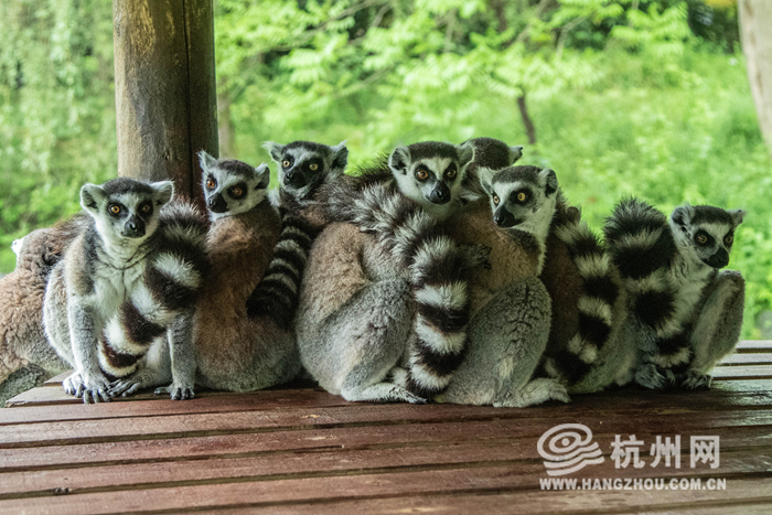 环尾狐猴是杭州野生动物世界不喜欢下雨的代表,遇上最近的强对流天气,它们连“营业”的心思都没有了,集体“摸鱼”。只要下雨,它们就抱成一团,或是睡觉或是互相梳理毛发。不过,要想让这个“团”就地解散也很简单,只要拿着饲养员分配好的食物向它们走去就可以啦!