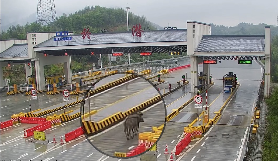 近日,杭州高速交警一大队接到於潜收费站工作人员电话称:“有两头水牛犊从ETC通道冲上了高速,两个人根本拦不住。”