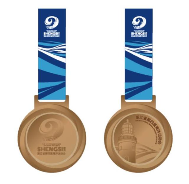 奖牌设计上,正面以旋转的层次线条表达浪花,烘托出海洋运动会的标志,展现了浙江在海洋运动发展中勇立潮头的使命担当。背面则是以嵊泗花鸟岛的标志灯塔为主要形象,伫立于海浪之上的灯塔不仅是嵊泗文旅的独特标识,更表达了对获奖运动员前途光明灿烂的美好祝愿。奖牌的挂带图案以海洋蓝为主色,高挂的会徽悬浮在蓝白海浪之上,仿佛东海海面上缓缓升起的太阳,给人们带来温暖与光明,展现了浙江省朝气蓬勃的海洋事业,也寓意着海洋运动的未来光明璀璨。