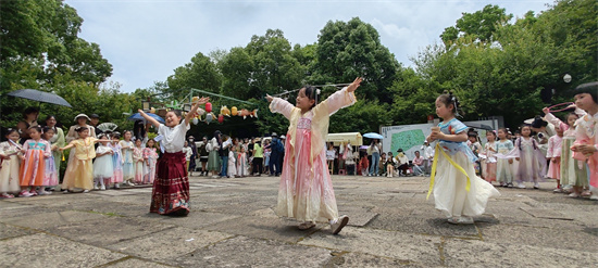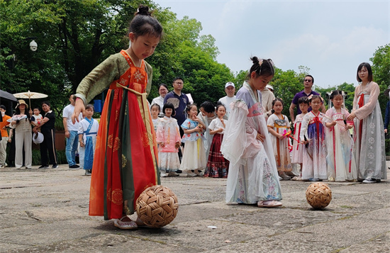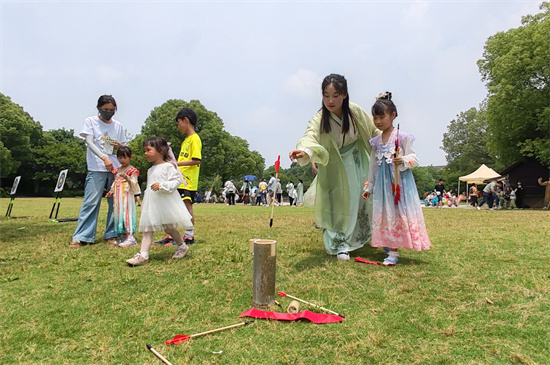 瞄准,投掷,中啦!孩子们兴奋地欢呼着,他们身着汉服,正兴致勃勃地玩着投壶游戏。5月19日是中国旅游日,在杭州西溪湿地国家公园,以“传世宋韵·浙江有礼”为主题的杭州市大华西溪风情幼儿园“国风雅韵·礼润童心”非遗展演活动正在举行。