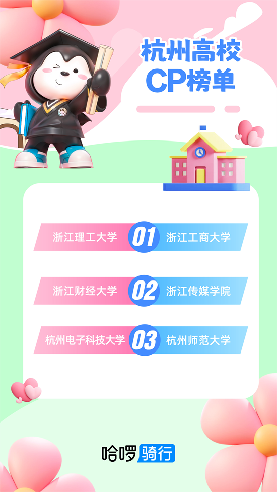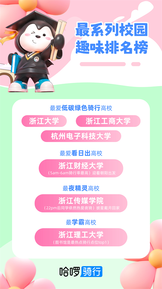 最爱低碳绿色骑行高校top3:浙江大学、浙江工商大学、杭州电子科技大学。