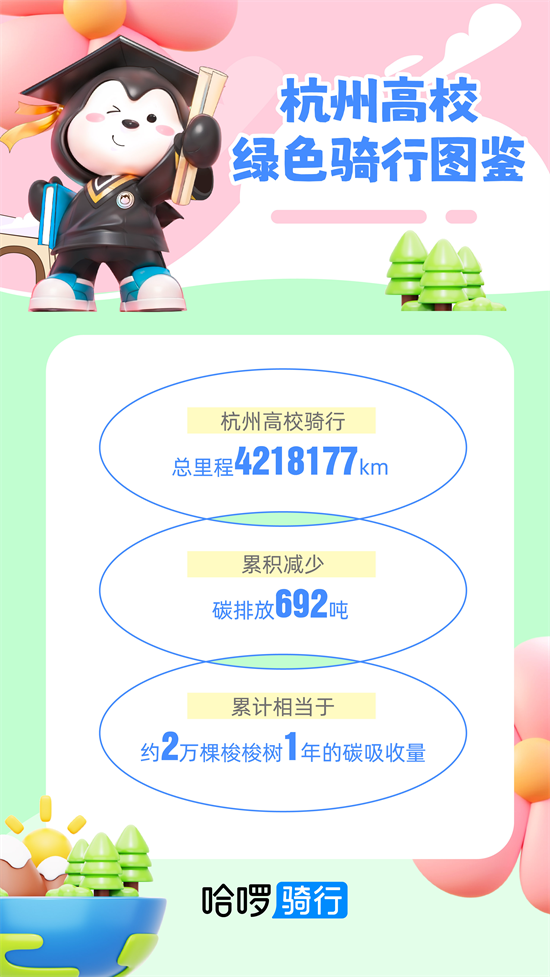 5月20日,《杭州哈啰高校绿色骑行图鉴》(以下简称《图鉴》)发布。数据显示,截至5月10日,杭州高校2024年骑行总里程约422万km,累计减少碳排放约692吨,相当于约2万棵梭梭树一年的碳吸收量。