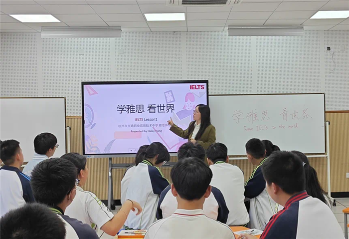 “所以我们要让学生提升英语水平,以英语为工具,深入了解世界,从而走向更广阔的国际舞台。”金宏说,为此,这个学期开始,学校引入了雅思课程,让英语基础好、对英语学习特别感兴趣或今后有意向留学的学生能够利用在校时间多学一点。目前有45名学生每周一下午自愿参加学习。学习这门课程,学生不需要再交学费,即可按雅思考试要求接受专业老师从听、说、读、写这四方面训练。