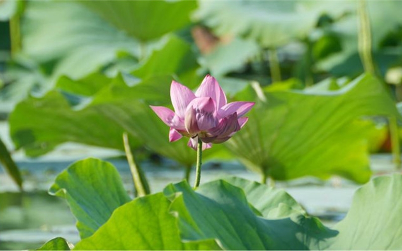 当天下午3点多,记者来到平湖秋月,沿着孤山后山路走,在绿油油的荷塘中发现一朵粉色的荷花亭亭玉立,美丽极了。