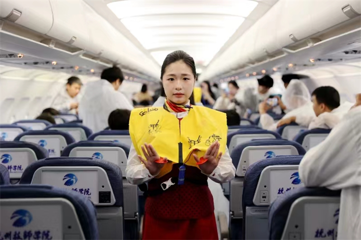 “客舱服务流程作为严谨且重要的工作,需要学生模拟真实的客舱环境,熟练掌握各项服务技能,提升服务质量,确保旅客安全与舒适。”杭州技师学院航空与游艇学院副院长刘书博说。